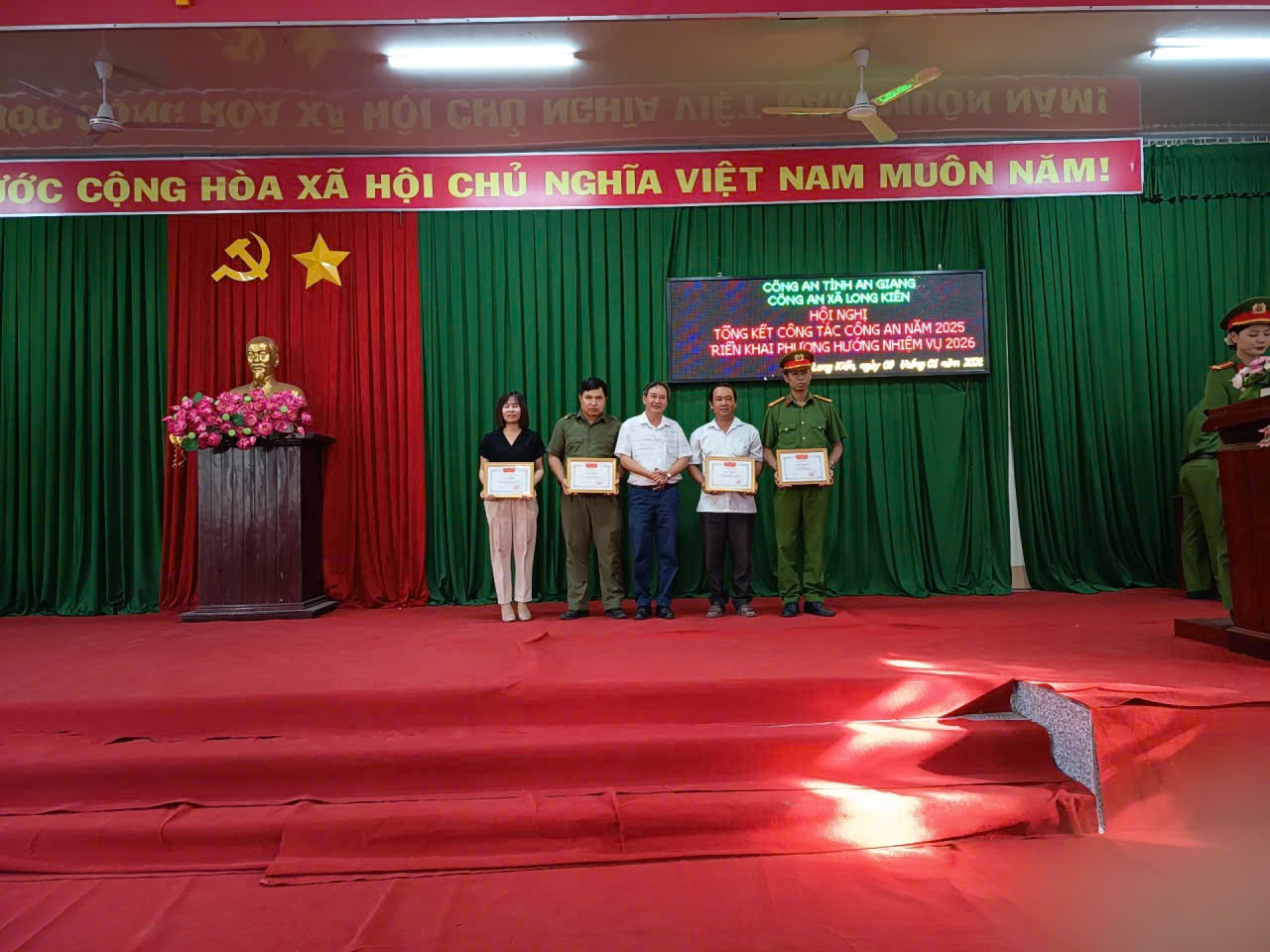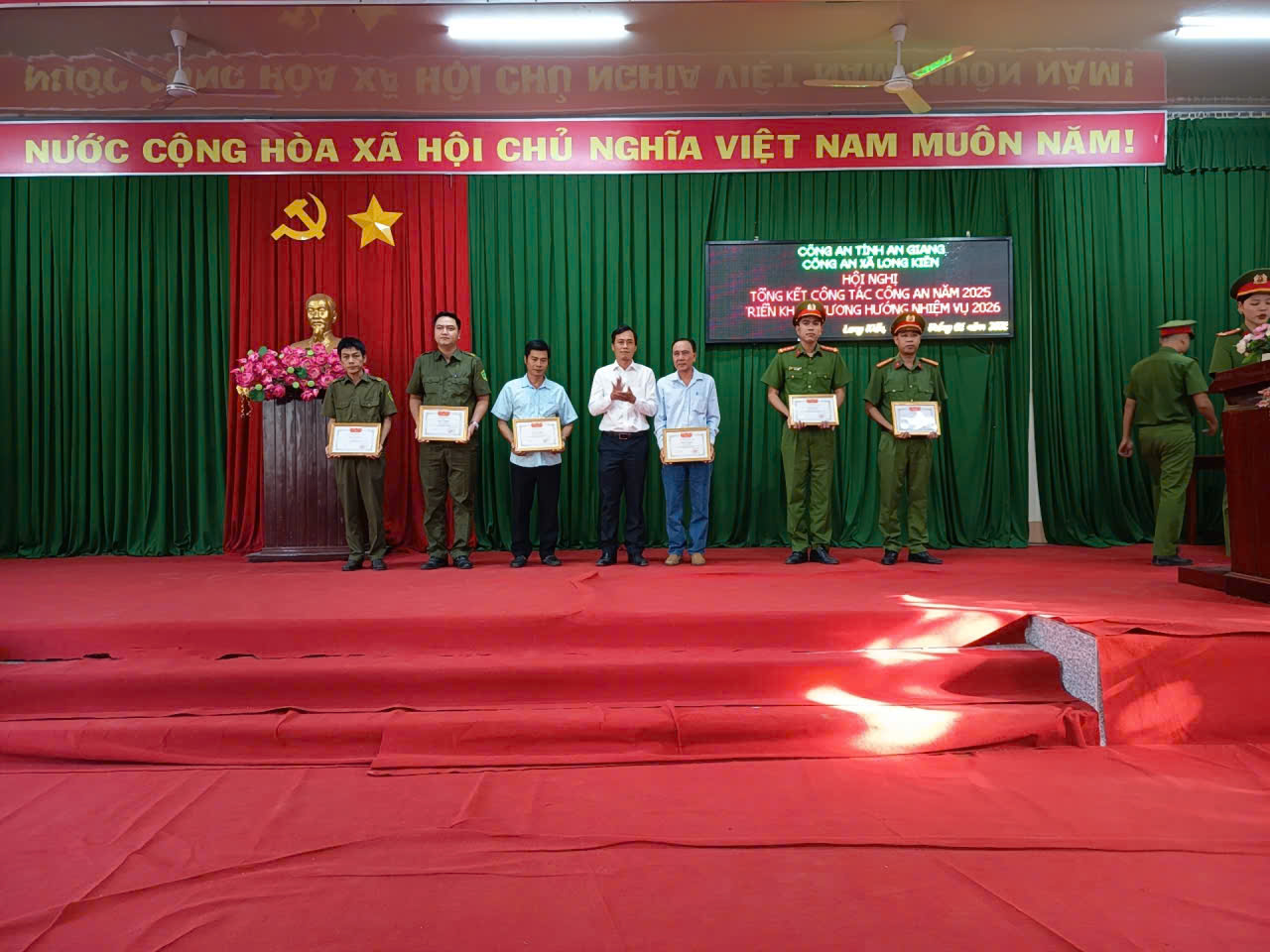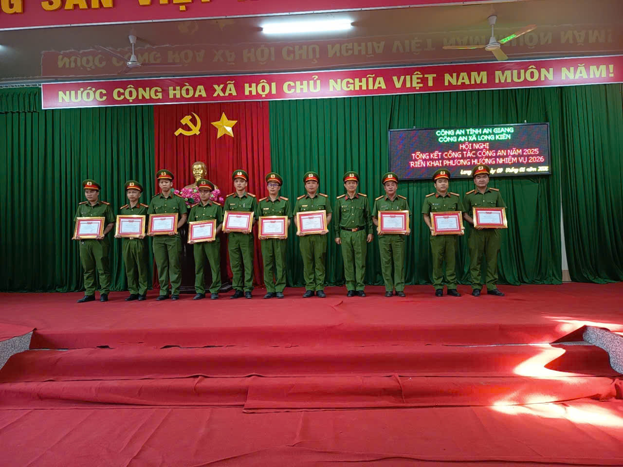 Ghi nhận những thành tích đạt được, tại hội nghị, Công an tỉnh đã trao tặng Bằng khen cho Công an xã Long Kiến đạt danh hiệu “Đơn vị Quyết thắng” năm 2025, trao danh hiệu Chiến sĩ thi đua cơ sở cho 10 cá nhân và Lao động tiên tiến cho 18 cá nhân. Dịp này, UBND xã Long Kiến cũng trao Giấy khen cho 4 tập thể và 7 cá nhân có thành tích xuất sắc trong công tác công an xã năm 2025.