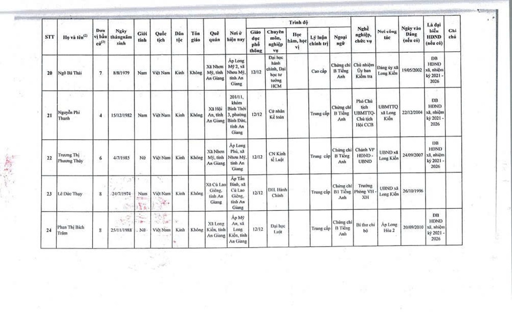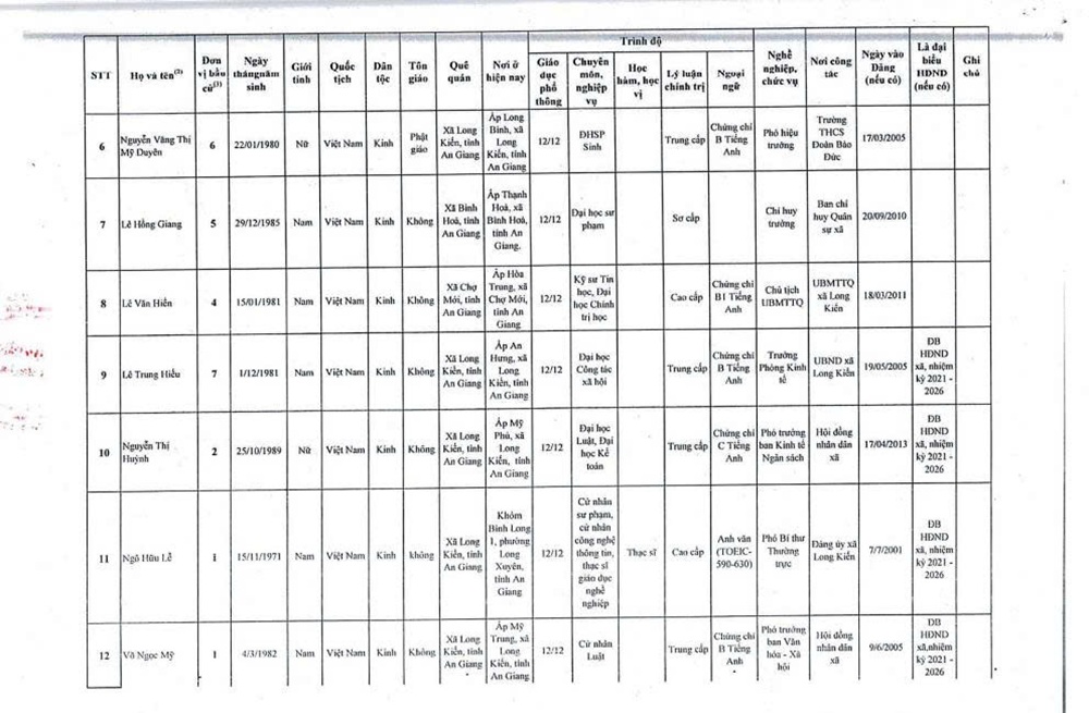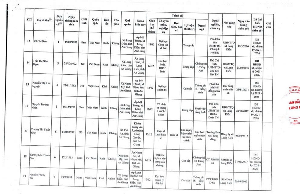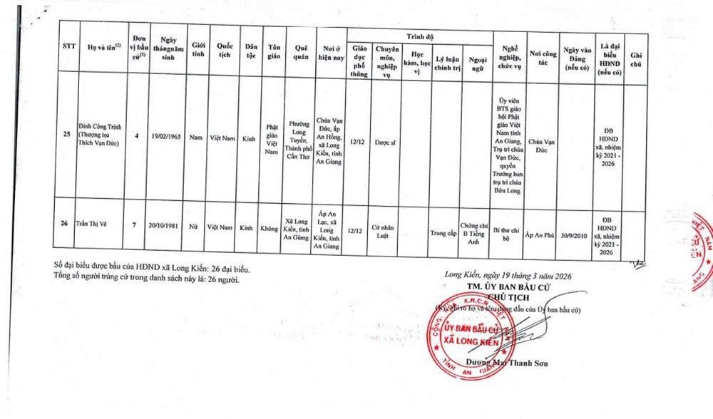 DANH SÁCH NHỮNG NGƯỜI TRÚNG CỬ ĐẠI BIỂU HỘI ĐỒNG NHÂN DÂN XÃ LONG KIẾN KHÓA XIII, NHIỆM KỲ 2026-2031
