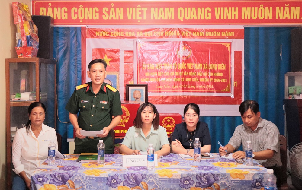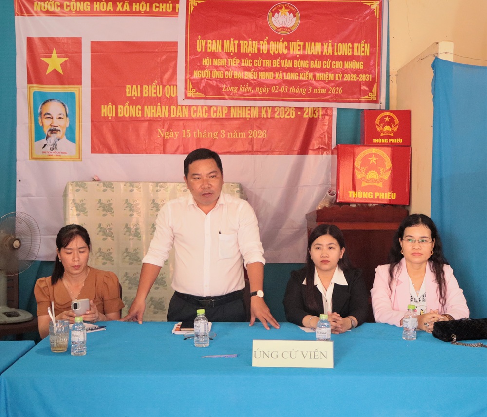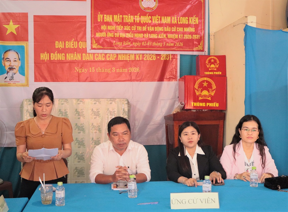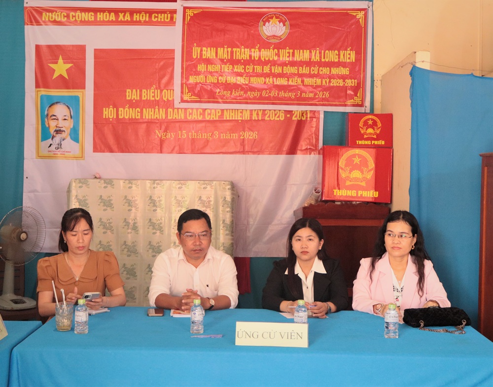 Trong 02 ngày 02 và 03/03/2026, tại Văn phòng của 23 ấp trên địa bàn xã Long Kiến đã diễn ra Hội nghị tiếp xúc cử tri những người ứng cử đại biểu HĐND xã Long Kiến khóa XIII, nhiệm kỳ 2026 – 2031. Hội nghị do Ủy ban MTTQ Việt Nam xã Long Kiến phối hợp tổ chức thực hiện theo đúng quy định của Luật Bầu cử đại biểu Quốc hội và đại biểu HĐND. Tham dự hội nghị có đại diện lãnh đạo Đảng ủy, HĐND, UBND, Ủy ban MTTQ Việt Nam xã cùng đông đảo cử tri trên địa bàn xã.