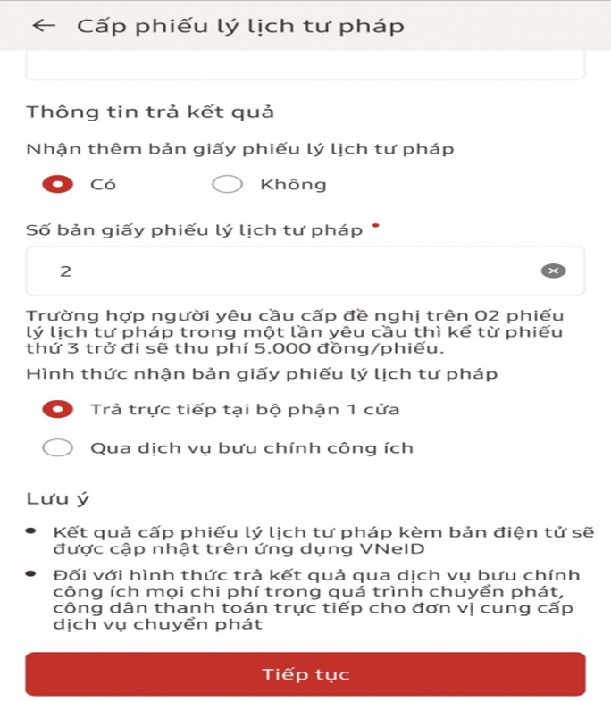 - Chọn hình thức nhận bản giấy phiếu lý lịch tư pháp: Trực tiếp hoặc qua Dịch vụ bưu chính công ích (kê khai cụ thể địa chỉ nhận phiếu). Sau đó chọn "Tiếp tục"