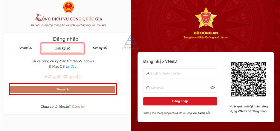 • Đăng nhập vào tài khoản trên Cổng dịch vụ công quốc gia: Chọn USB chữ ký số ➞ Bấm “Đăng nhập”;