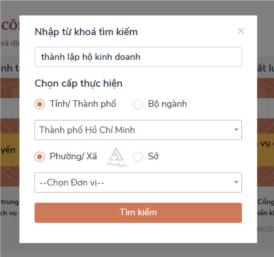 Trên thanh tìm kiếm, bạn thao tác như sau: Chọn “Tìm kiếm nâng cao” ➞ Nhập từ khóa “thành lập hộ kinh doanh” ➞ Chọn tỉnh thành, phường xã muốn mở hộ kinh doanh ➞ Chọn “Tìm kiếm”.
