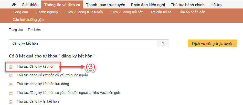 - Bước 2: Nhấn chọn “Thủ tục đăng ký kết hôn” (3)