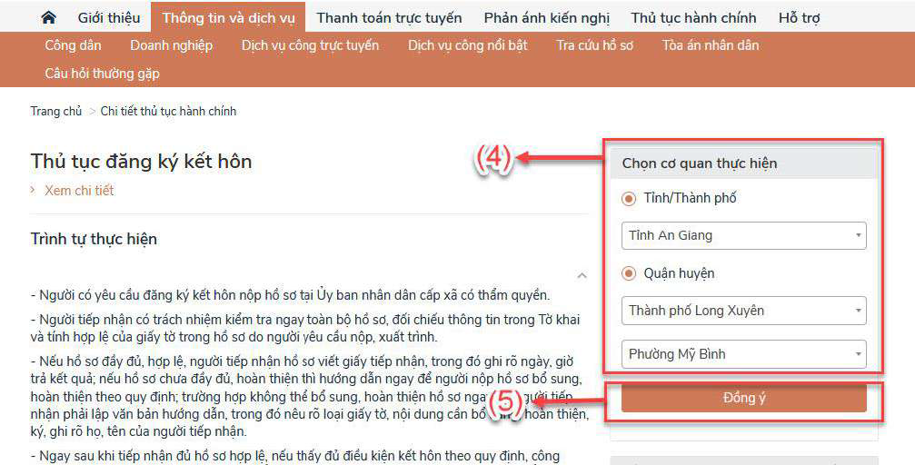 - Bước 3: Chọn cơ quan thực hiện việc đăng ký khai sinh (4) và nhấn đồng ý (5)