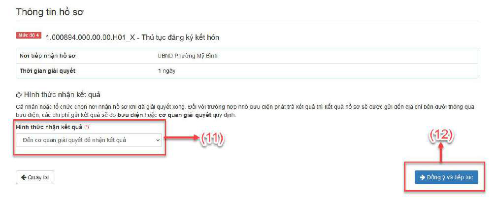 - Bước 7: Chọn hình thức nhận kết quả (11). Nhấn “Đồng ý và tiếp tục” (12)