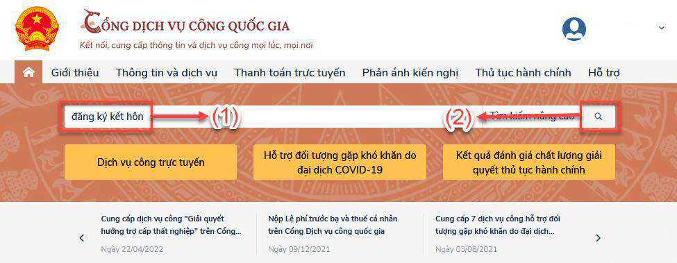 - Bước 1: Gõ vào ô tìm kiếm với nội dung “thủ tục đăng ký kết hôn” (1) tại màn hình chính của Cổng dịch vụ công quốc gia và chọn tìm kiếm (2).