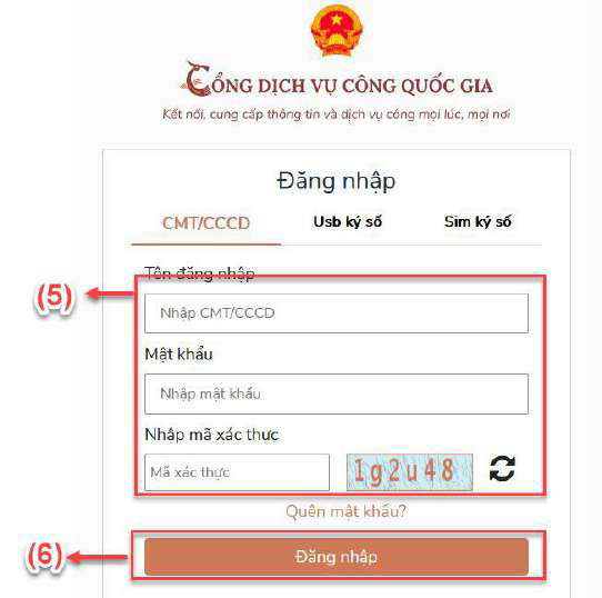 - Bước 2: Chọn tài khoản cấp bởi cổng dvc quốc gia (3), Chọn phương thức đăng nhập bằng CMT/CCCD (4). Tại đây, bạn nhập chính xác thông tin vào các ô (5) và nhấn đăng nhập (6).