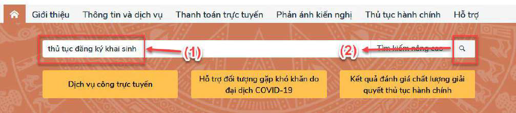 - Bước 1: Gõ vào ô tìm kiếm với nội dung “thủ tục đăng ký khai sinh” (1) tại màn hình chính của Cổng dịch vụ công quốc gia và chọn tìm kiếm (2).