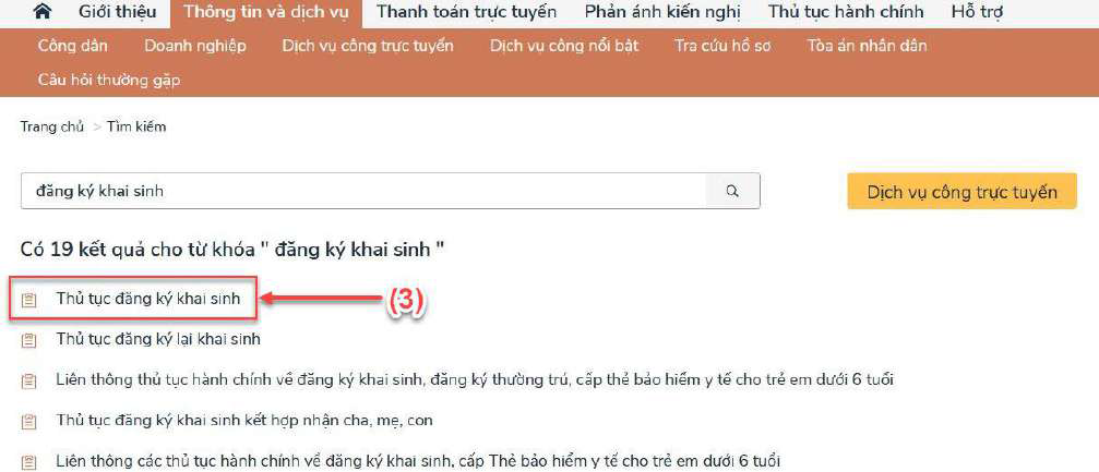 - Bước 2: Nhấn chọn thủ tục đăng ký khai sinh (3)