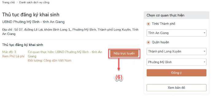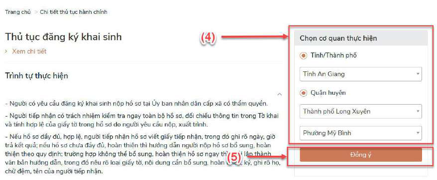 - Bước 3: Chọn cơ quan thực hiện việc đăng ký khai sinh (4) và nhấn đồng ý (5)