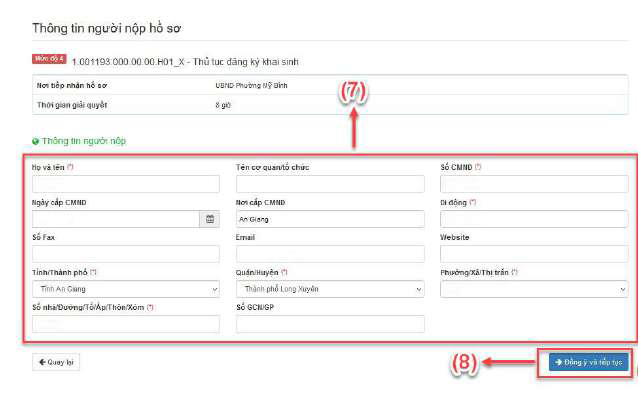 - Bước 5: Điền đầy đủ các thông tin có dấu sao đỏ (*) (7), sau đó nhấn đồng ý và tiếp tục (8)