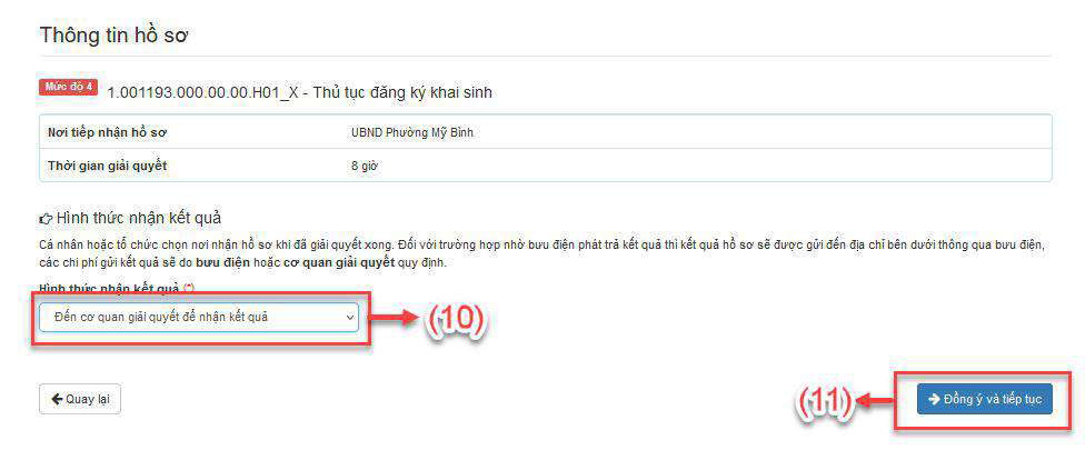 - Bước 7: Chọn hình thức nhận kết quả là “Đến cơ quan giải quyết để nhận kết quả” (10) và nhấn Đồng ý và tiếp tục (11)