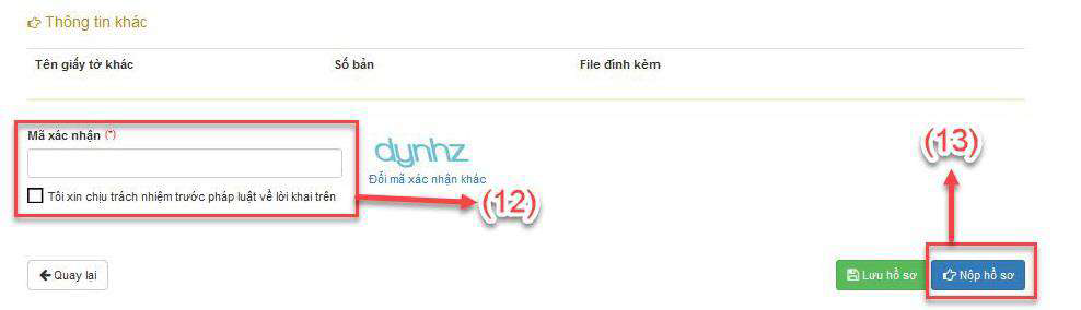- Bước 8: Nhập mã xác nhận và đánh dấu và ô “Tôi xin chịu trách nhiệm trước pháp luật về lời khai trên (12). Nhấn nộp hồ sơ (13).