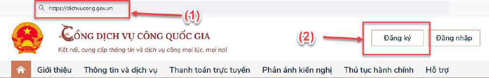 - Bước 1: Mở trình duyệt web (chrome, firefox,…), truy cập vào địa chỉ https://dichvucong.gov.vn (1) và nhấn chọn vào nút đăng ký (2)