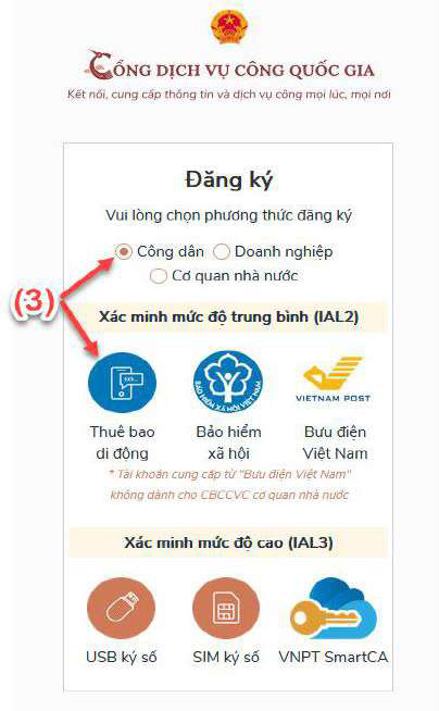 - Bước 2: Chọn phương thức đăng ký là: Công dân, xác minh mức độ trung bình chọn: Thuê bao di dộng (3)