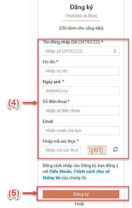 Nhập chính xác thông tin vào các ô có dấu sao đỏ (*) (4) và nhấn đăng ký (5).