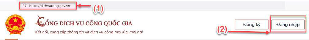 - Bước 1: Mở trình duyệt web (chrome, firefox,…), truy cập vào địa chỉ https://dichvucong.gov.vn (1) và nhấn chọn vào nút đăng nhập (2)
