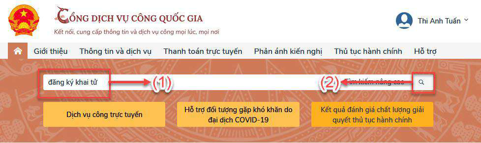 - Bước 1: Gõ vào ô tìm kiếm với nội dung “thủ tục đăng ký khai tử” (1) tại màn hình chính của Cổng dịch vụ công quốc gia và chọn tìm kiếm (2).