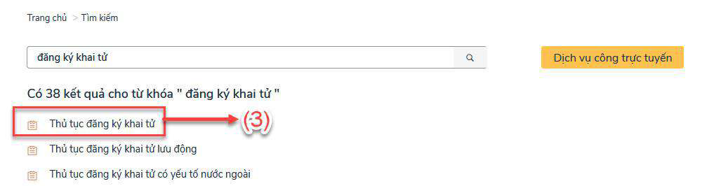 - Bước 2: Nhấn chọn “Thủ tục đăng ký khai tử” (3)