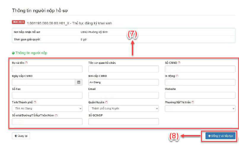 - Bước 5: Điền đầy đủ các thông tin có dấu sao đỏ (*) (7), sau đó nhấn đồng ý và tiếp tục (8)