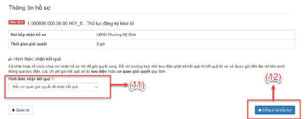 - Bước 7: Chọn hình thức nhận kết quả (11). Nhấn “Đồng ý và tiếp tục” (12)