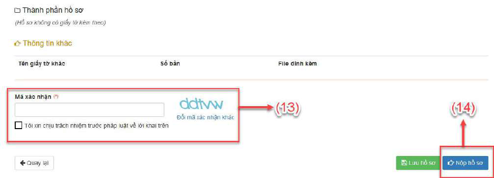 - Bước 8: Nhập mã xác nhận và đánh dấu và ô “Tôi xin chịu trách nhiệm trước pháp luật về lời khai trên (13). Nhấn nộp hồ sơ (14).