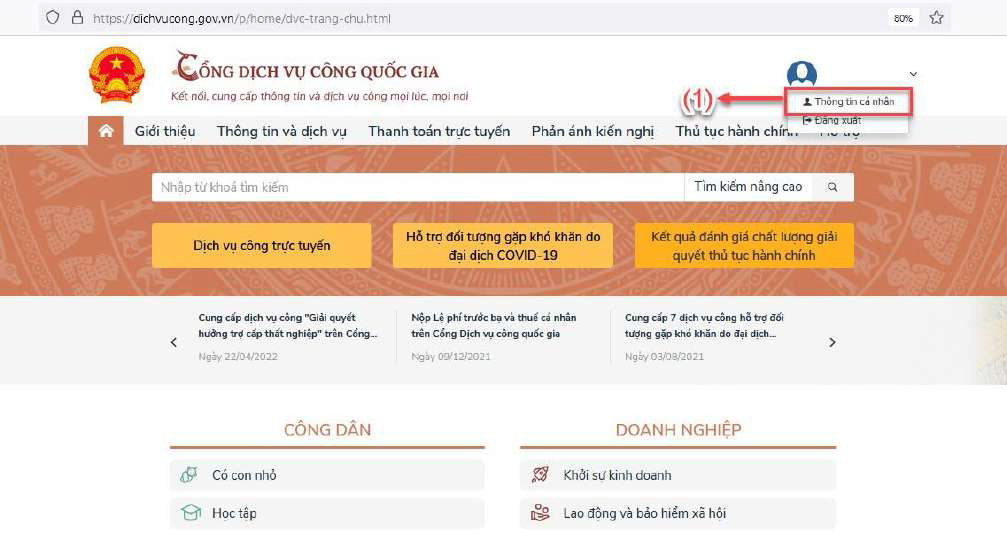 - Bước 1: Đăng nhập vào Cổng dịch vụ công quốc gia và chọn Thông tin cá nhân (1)
