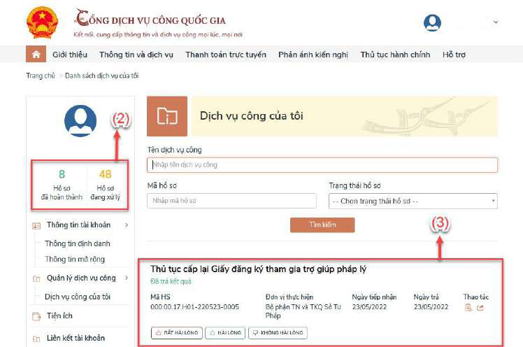 - Bước 2: Xem lại tổng số hồ sơ đã nộp đã hoàn thành, số hồ sơ đang xử lý (2). Xem chi tiết thủ tục hành chính đã nộp và kết quả giải quyết trực tuyến (nếu có) (3).