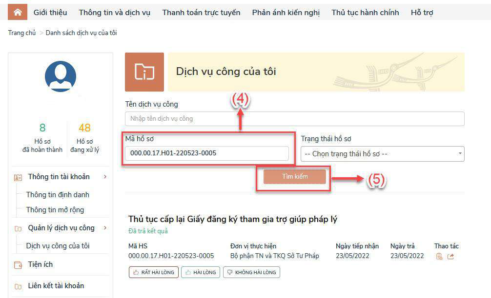 - Bước 3: Tra cứu hồ sơ đã nộp: Nhập mã hồ sơ vào (4) và nhấn tìm kiếm (5)