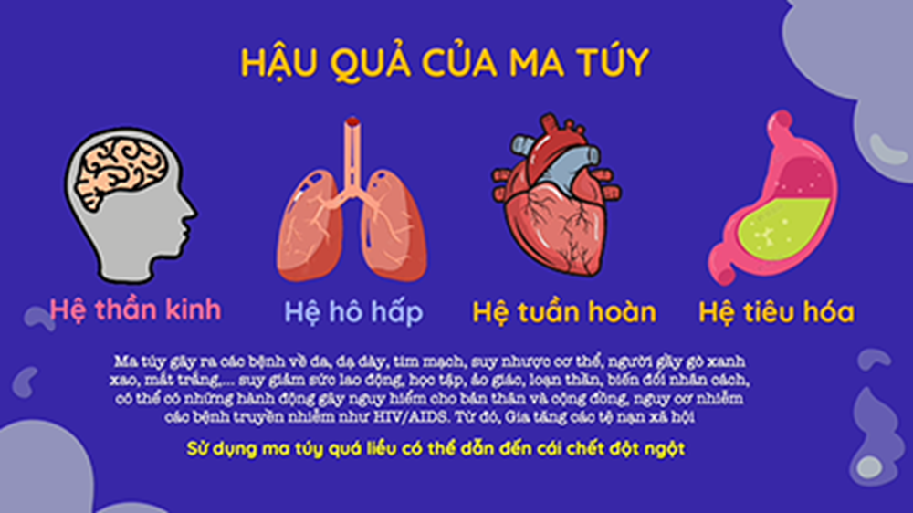 Ma túy luôn là hiểm họa nhức nhối của toàn xã hội, là nguyên nhân đe dọa tương lai của mỗi cá nhân, phá nát hạnh phúc gia đình và gây mất an ninh trật tự cộng đồng. Đặc biệt, sự xuất hiện của các loại ma túy tổng hợp, chất hướng thần mới với những thủ đoạn tinh vi của các loại tội phạm về ma túy đang đẩy mối nguy hiểm lên mức báo động. Tác hại của ma túy gây ra cho mỗi cá nhân, gia đình và xã hội là vô cùng nghiêm trọng. Đối với cá nhân nếu sử dụng ma túy sẽ làm cho Sức khỏe suy kiệt, hủy hoại não bộ, gan, thận, tim mạch... gây ảo giác, hoang tưởng, rối loạn tâm thần, dẫn đến cái chết. Sử dụng trong thời gian dài sẽ dẫn đến mất kiểm soát hành vi, Dễ gây ra các hành vi bạo lực, phạm tội, mất đi cơ hội học tập, làm việc, dễ bị kỳ thị trong xã hội. Không chỉ bản thân, mà gia đình những người nghiện ma túy cũng bị ảnh hưởng rất lớn. Nó chính là một trong những nguyên nhân gây nên sự mâu thuẫn, xung đột, đổ vỡ, tan nát hạnh phúc của các gia đình. Nhiều gia đình vì có người mắc vào tệ nạn ma túy đã khiến cho cha mẹ đau khổ, vợ chồng chia ly, con cái phải bơ vơ. Bên canh đó là ảnh hưởng đến tình trạng kinh tế của gia đình, nó bào mòn tài sản, đẩy các gia đình vào cảnh nợ nần chồng chất, khó khăn, nghèo đói và kiệt quệ về kinh tế. Đối với xã hội, ma túy chính là một trong những nguyên nhân dẫn đến mất an ninh, trật tự xã hội. Dẫn đến sự gia tăng của các loại tội phạm như: trộm cắp, lừa đảo, cướp giật, giết người…Ma túy còn để lại hậu quả nghiêm trọng về sau đó là làm suy yếu giống nòi, cản trở sự phát triển kinh tế xã hội của đất nước. Cùng với sự phát triển của khoa học, công nghệ, ngày càng có nhiều loại ma túy mới được tạo ra, Đặc biệt là các loại ma túy tổng hợp, Chất kích thích, chất hướng thần. Chúng được bào chế, pha trộn vô cùng tinh vi, dưới nhiều hình thức khác nhau như dưới dạng trà sữa, kẹo, thuốc lá điện tử..., có khả năng gây nghiện nhanh, tác hại tàn khốc hơn gấp nhiều lần, đẩy người sử dụng vào trạng thái "phê" cực đoan, dễ gây ảo giác, tự hủy hoại bản thân hoặc gây ra án mạng.
