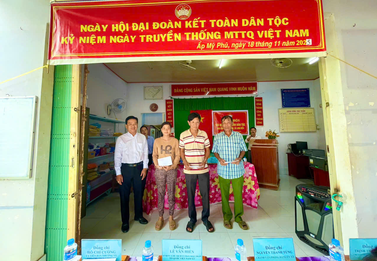 Mở đầu ngày hội, các vị lãnh đạo, các vị khách quý đã cùng nhau ôn lại truyền thống lịch sử, vẻ vang kỷ niệm 95 năm Ngày thành lập Mặt trận Dân tộc Thống nhất Việt Nam (18/11/1930 – 18/11/2025). Đồng thời, nghe báo cáo về kết quả thực hiện nâng chất ấp văn hoá năm 2025, theo đó năm qua dưới sự phấn đấu, nổ lực và đoàn kết, Ban vận động ấp Mỹ Phú đã thực hiện tốt phong trào đến ơn đáp nghĩa đã vận động được số tiền trên 400 triệu đồng để hỗ trợ cho hộ nghèo, hộ cận nghèo như: cất mới và sửa chữa 04 căn nhà tình thương, nhà Đại đoàn kết, phát hàng trăm phần quà…; tỷ lệ hộ nghèo, hộ cận nghèo đều giảm hàng năm, hiện ấp còn 03 hộ nghèo và 10 hộ cận nghèo, ấp không còn nhà xiêu vẹo, dột nát; 100% trẻ em trong độ tuổi đi học đều được đến trường; 100% hộ gia đình đều có nhà họp vệ sinh. Các phong trào văn hoá văn nghệ - thể dục thể thao đều được duy trì và ngày càng phát triển.