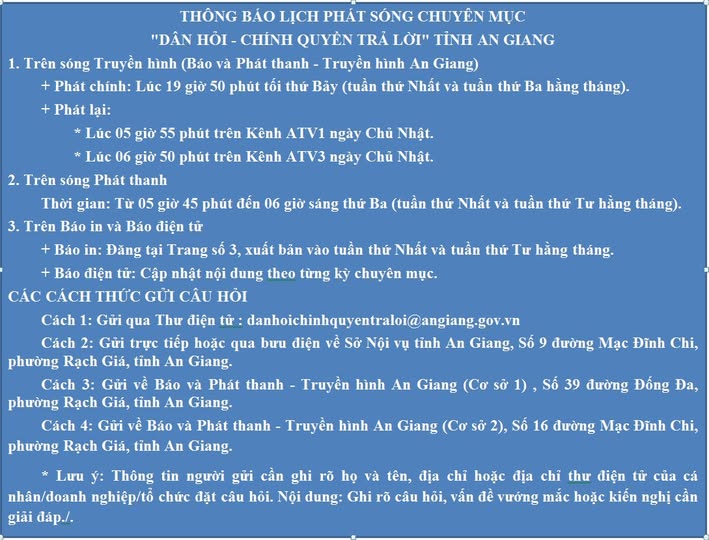THÔNG BÁO LỊCH PHÁT SÓNG CHUYÊN MỤC "DÂN HỎI - CHÍNH QUYỀN TRẢ LỜI" TỈNH AN GIANG