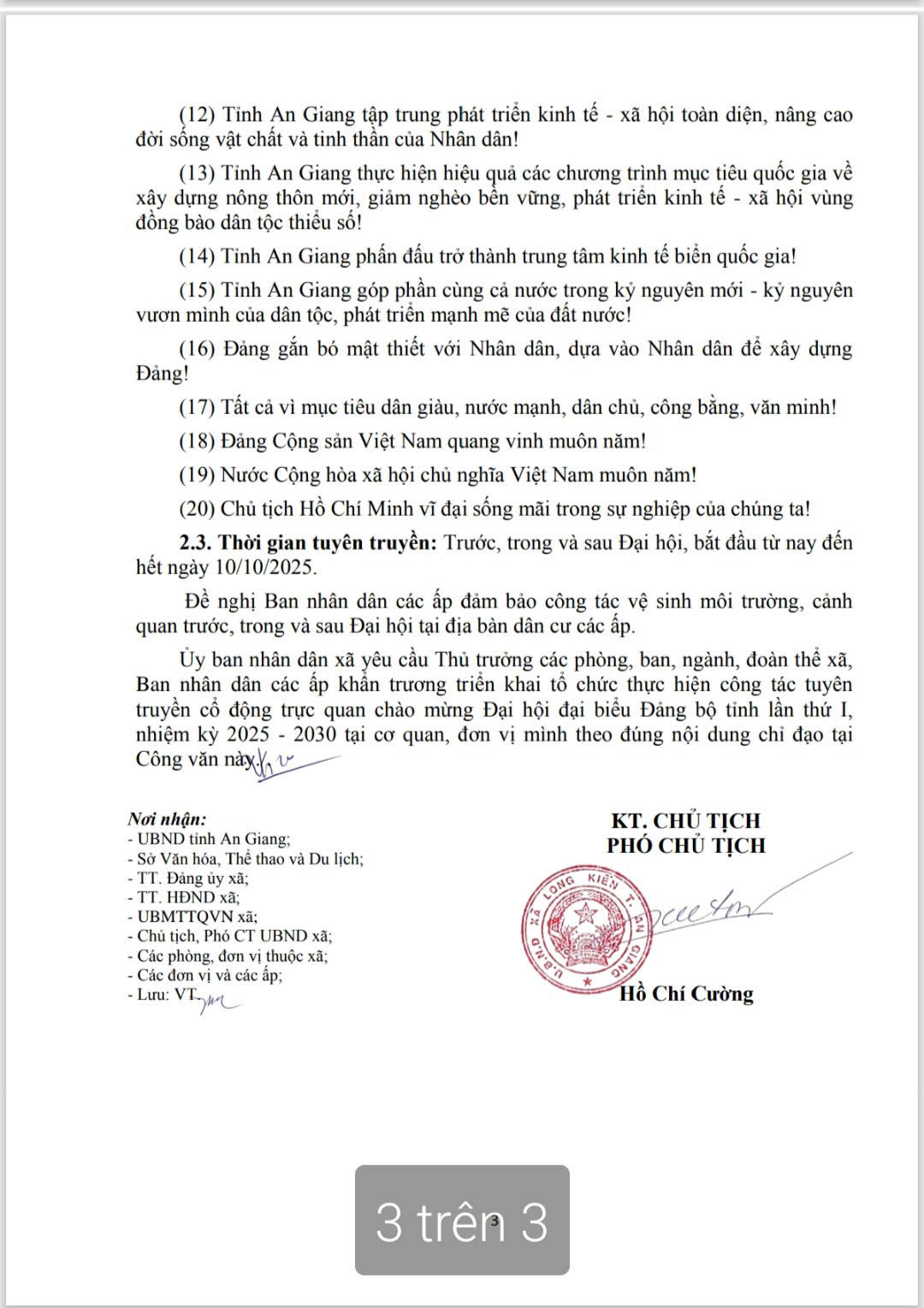 Tin tức sự kiện Văn hóa Thông tin chỉ đạo điều hành Thông báo THÔNG BÁO TREO CỜ CHÀO MỪNG ĐẠI HỘI ĐẢNG BỘ TỈNH AN GIANG LẦN THỨ I, NHIỆM KỲ 2025 - 2030 01/10/2025 - aA + Submitted by Quản trị viên on 1 October 2025 Tài liệu đính kèm: 2241 Thông báo treo cờ Đảng, cờ Tổ quốc và tuyên truyền cổ độg trực quan chào mừng Đại hội đại biểu Đảng.signed.pdf (555.57 KB) Bài viết liên quan VNPT Chợ Mới ký kết thỏa thuận hợp tác với UBND xã Long Kiến về chuyển đổi số giai đoạn 2025 – 2030 24/10/2025 Tình hình KT – XH có nhiều chuyển biến tích cực 24/10/2025 Đại hội đại biểu Hội cựu chiến binh lần thứ 1, nhiệm kỳ 2025 – 2030 23/10/2025 Đại hội đại biểu Đoàn TNCS Hồ Chí Minh xã Long Kiến lần thứ 1, nhiệm kỳ 2025 – 2030 23/10/2025 Đại hội đại biểu Phụ nữ xã Long Kiến lần thứ 1 22/10/2025 Tưng bừng ngày hội việc làm 22/10/2025