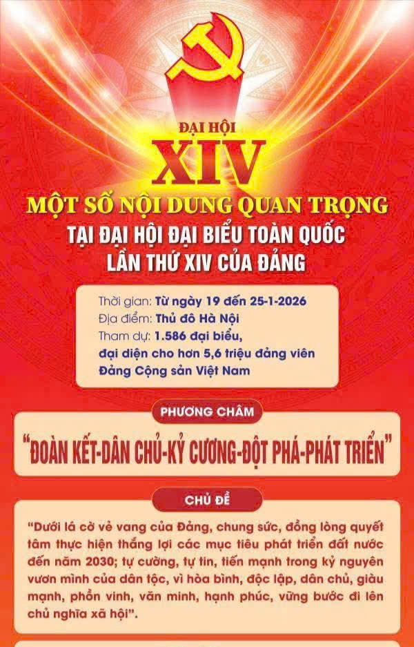 Đại hội đại biểu toàn quốc lần thứ XIV của Đảng sẽ chính thức diễn ra tại Thủ đô Hà Nội từ ngày 19/1 đến 25/1/2026. Những ngày này, nhiều tuyến phố trên khắp nẻo đường quê hương được trang hoàng rực rỡ cờ hoa, pano, áp phích chào mừng Đại hội, thể hiện niềm tin, kỳ vọng của Nhân dân trước sự kiện chính trị đặc biệt quan trọng của đất nước.