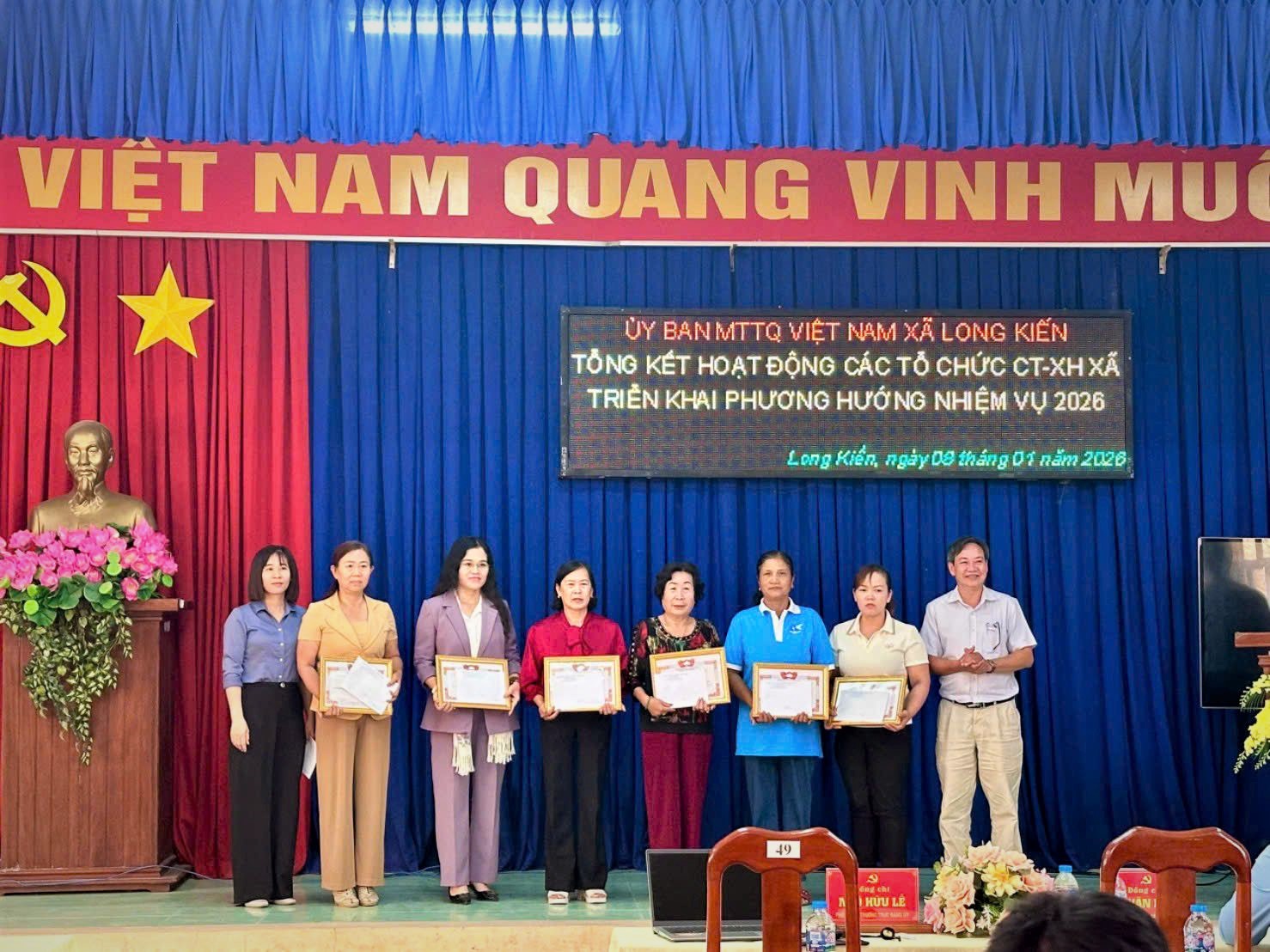 Sáng ngày 08/01/2026, Hội Liên hiệp Phụ nữ xã Long Kiến tổ chức Hội nghị tổng kết công tác Hội và phong trào phụ nữ năm 2025. Đến dự có ông Ngô Hữu Lễ – Phó Bí thư Thường trực Đảng ủy xã, ông Lê Văn Hiền – CT. MTTQVN xã.