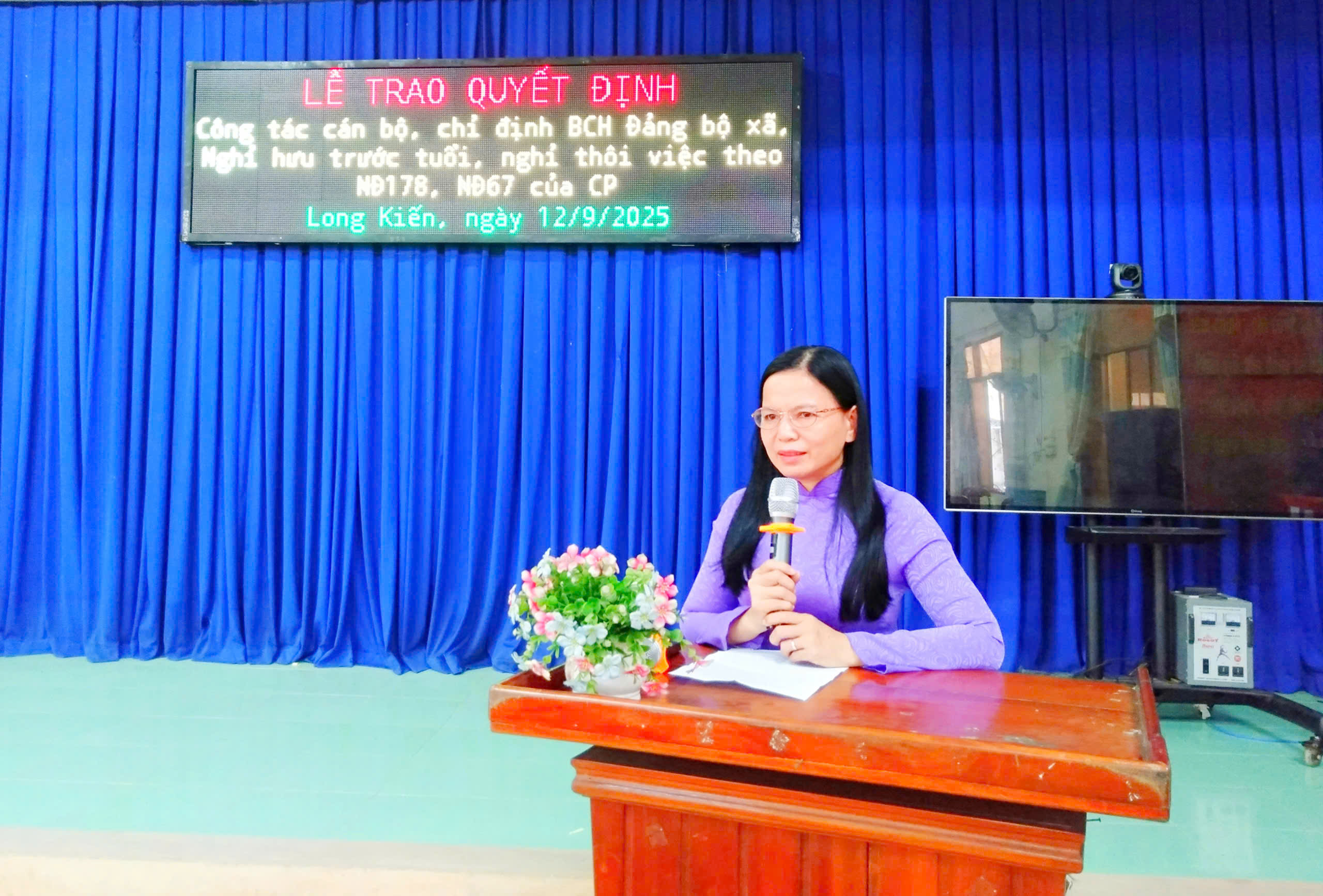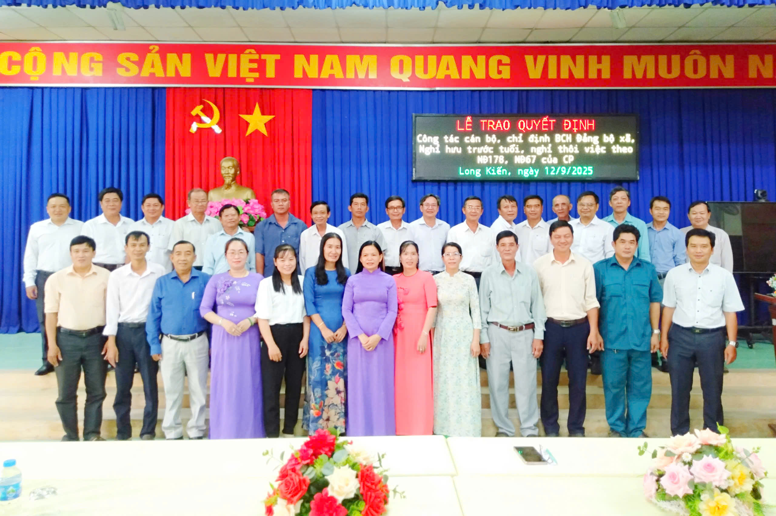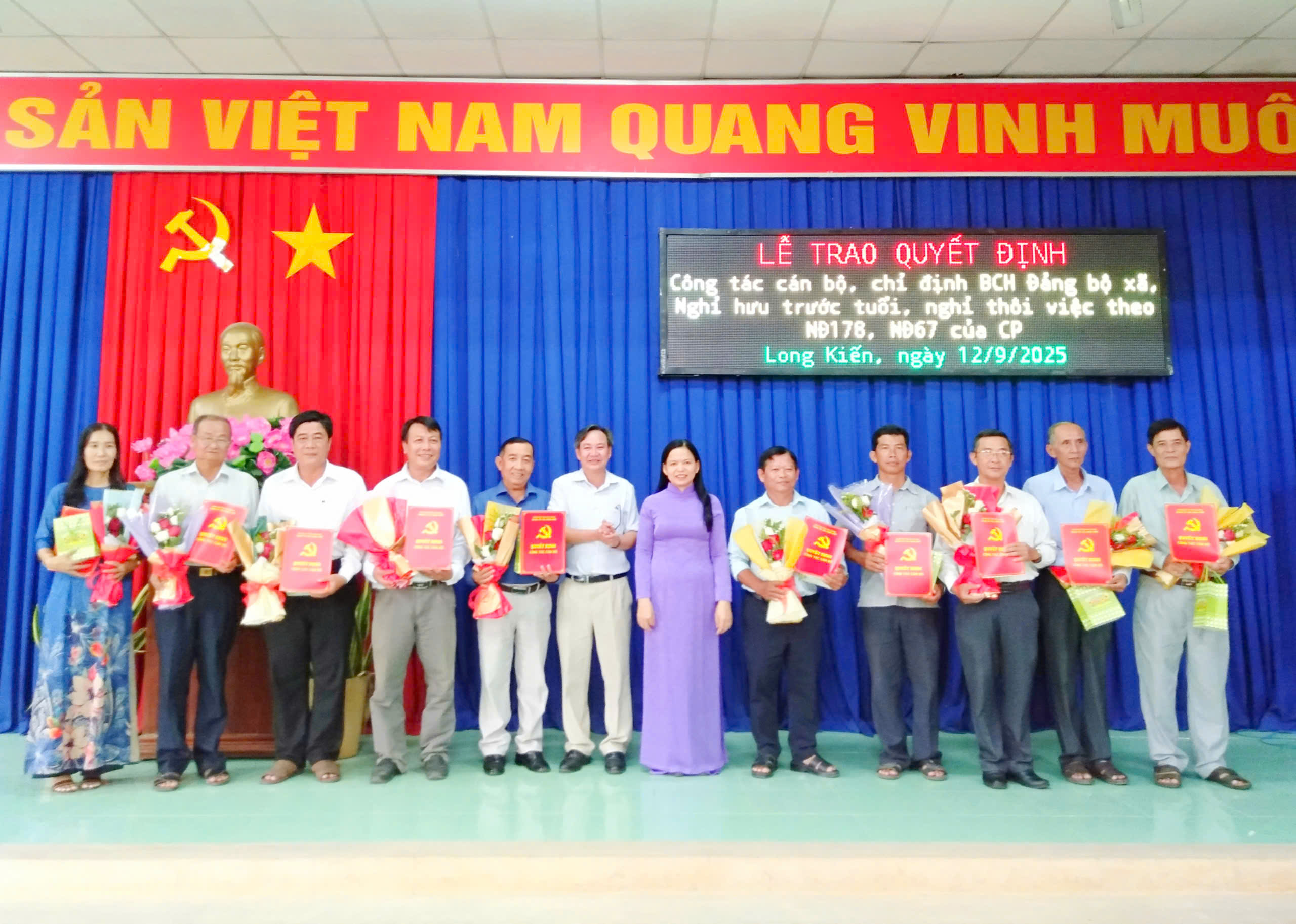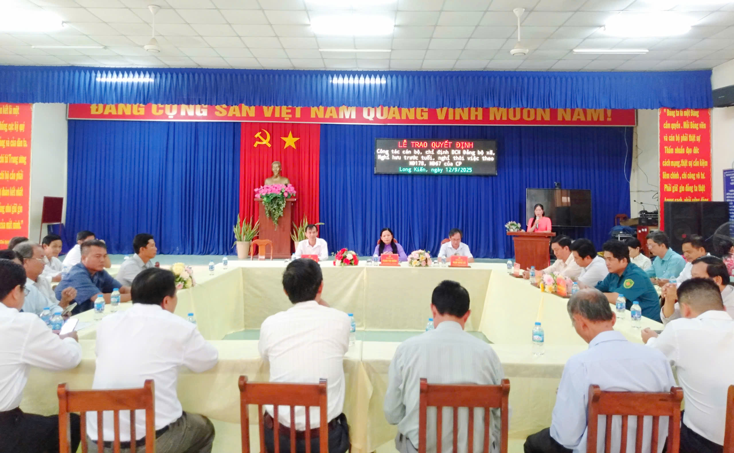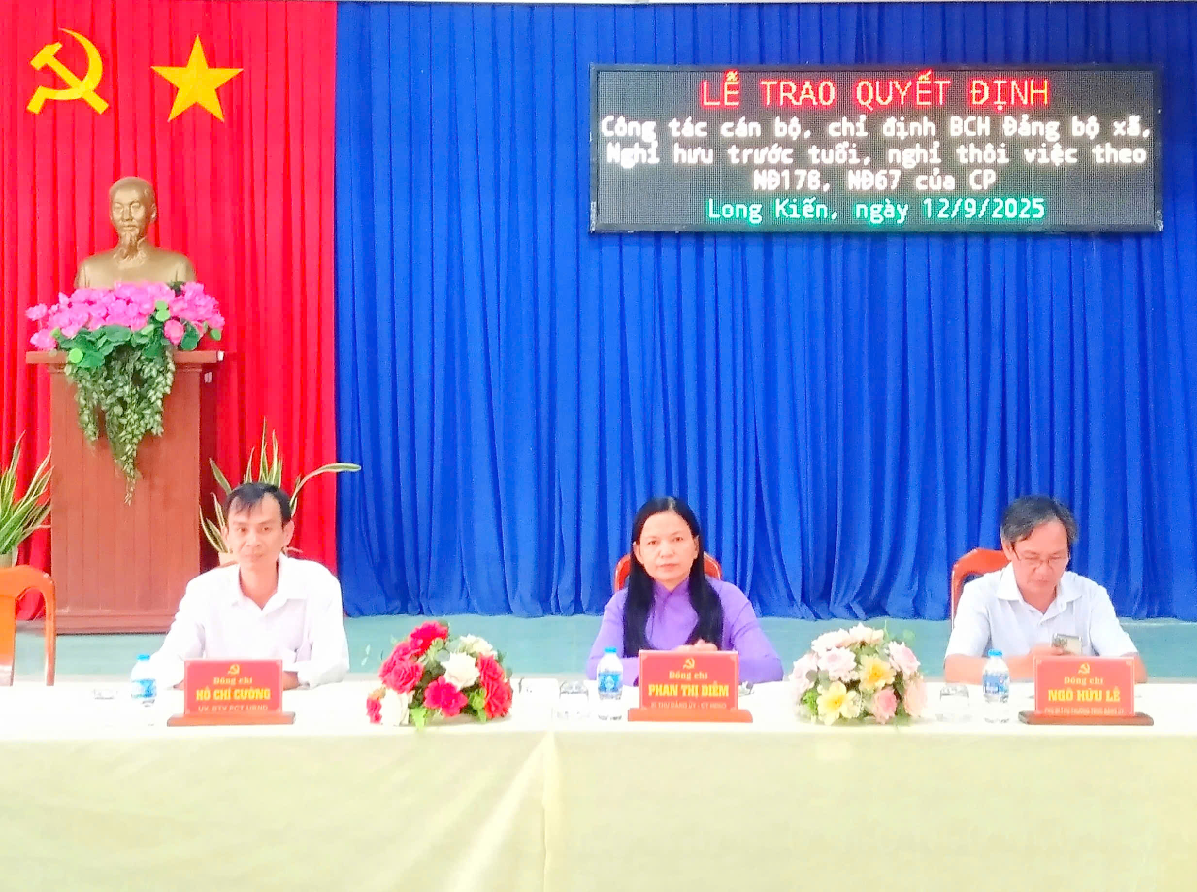 Chiều ngày 12/09/2025 Đảng uỷ xã Long Kiến tổ chức lễ trao Quyết định công tác cán bộ, chỉ định Ban chấp hành Đảng bộ xã, nghỉ hưu trước tuổi, nghỉ hưu thôi việc theo Nghị định 178, Nghị định 67 của Chính phủ. Đến dự có đồng chí Phan Thị Diễm – Bí thư Đảng uỷ - CT. HĐND xã, đồng chí Ngô Hữu Lễ - Phó Bí thư Thường trực Đảng uỷ, đồng chí Hồ Chí Cường – PCT. UBND xã.