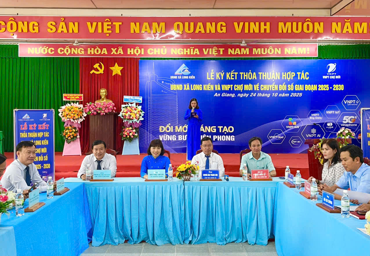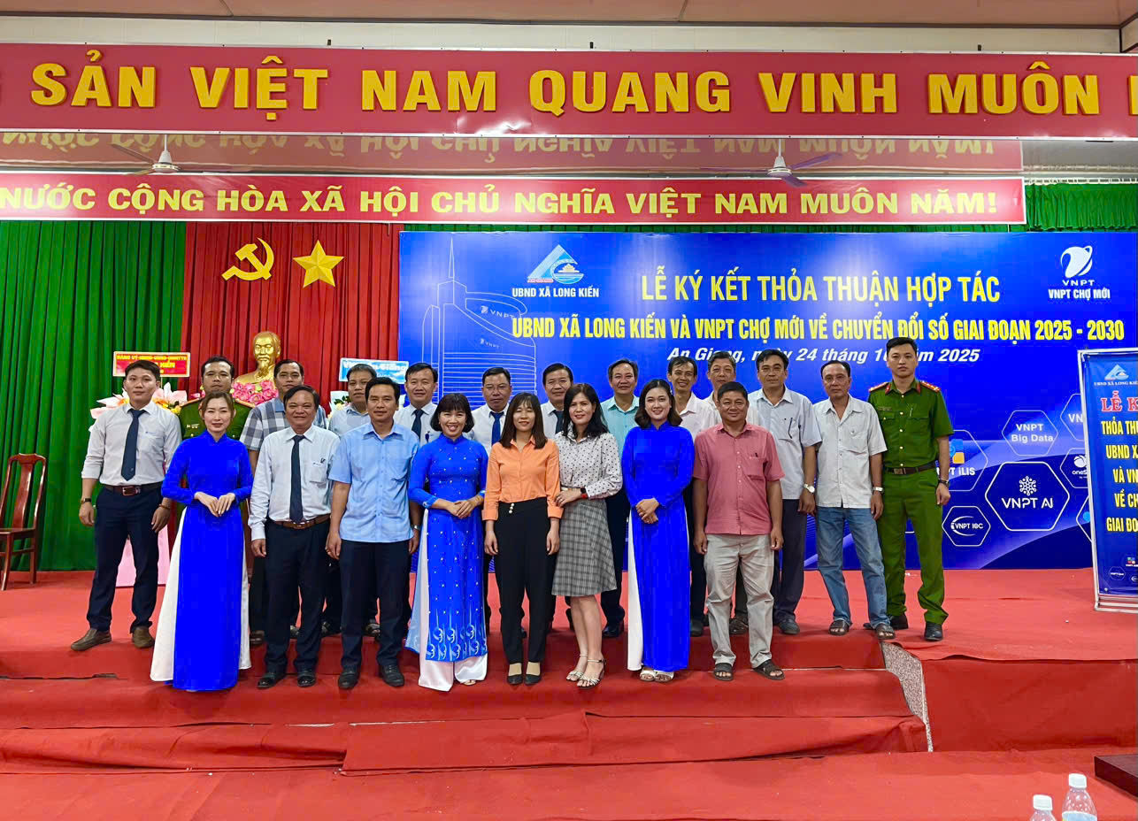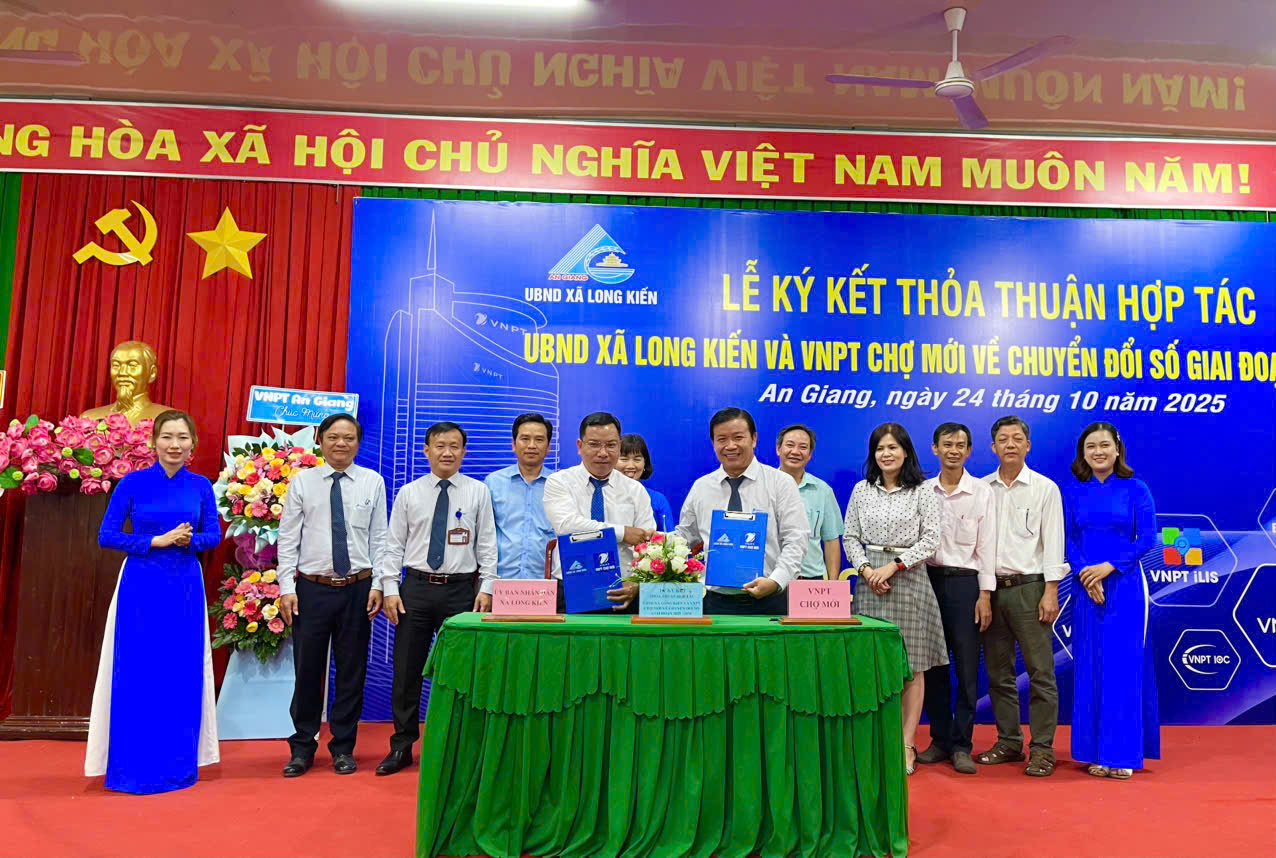 Tại UBND xã Long Kiến, chiều ngày 24/10/2025 đã diễn ra buổi lễ ký kết thỏa thuận hợp tác giữa UBND xã Long Kiến và VNPT Chợ Mới về chuyển đổi số giai đoạn 2025 – 2030. Đến dự có ông Ngô Hữu Lễ - Phó Bí thư Thường trực Đảng uỷ xã, ông Dương Mai Thanh Sơn – CT. UBND xã, bà Hồ Thị Thắm – Giám đốc Phòng khách hàng doanh nghiệp VNPT An Giang, ông Trịnh Lê Thanh Sang – Giám đốc VNPT Chợ Mới.